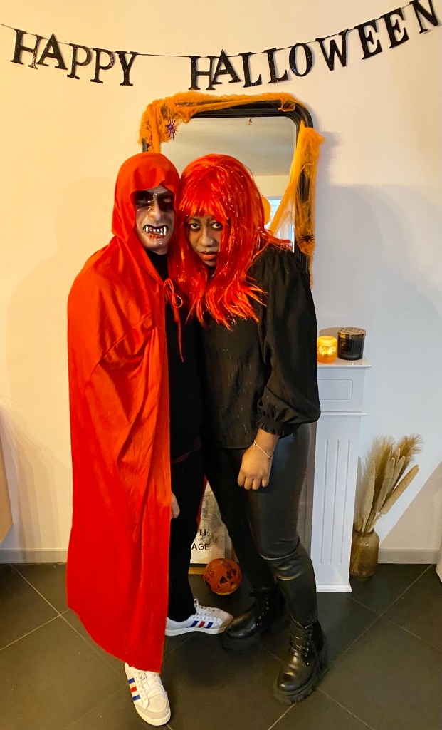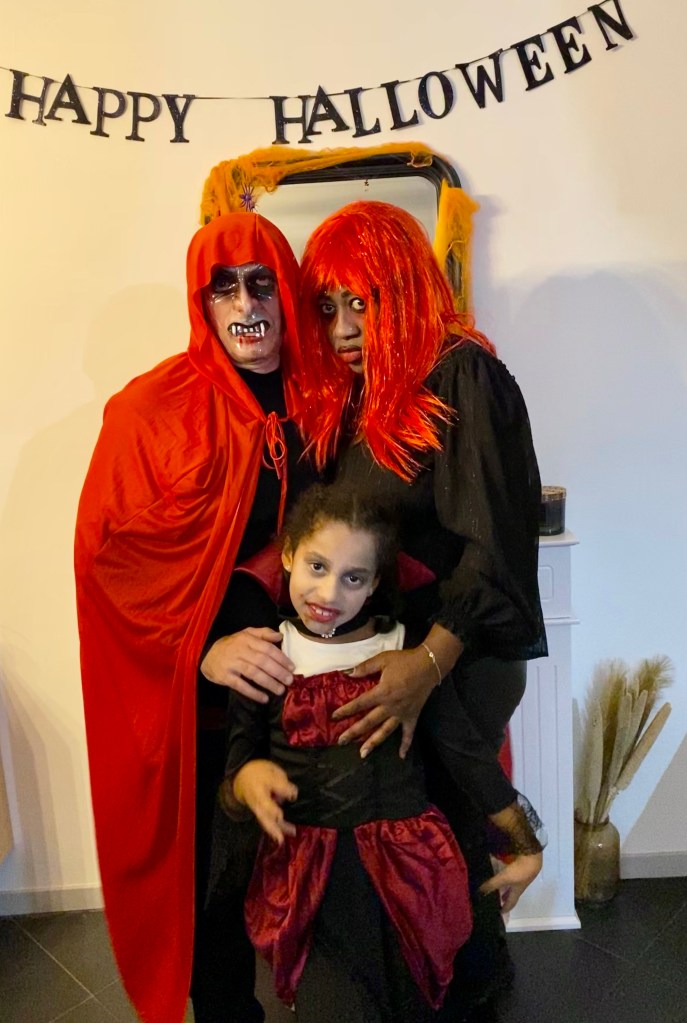 Avec Inaïa et Julien, nous étions la famille Vampire !!! Bon pour ma part, la vampire avait pris cher, semblait sous acide haha (manque de temps et d’organisation) et sortie tout droit d’une soirée disco avec cette perruque rouge qui était juste loufoque !!!